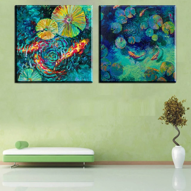 Zz2208 2 Pcs Cetakan Kanvas Seni Abstrak Lukisan Minyak Ikan Koi
